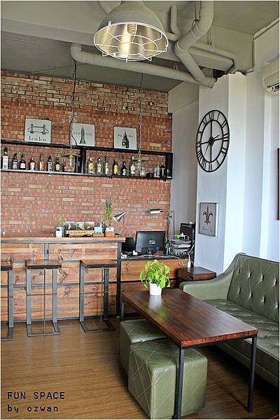 紅磚牆後方是廚房,木頭櫃是吧台也是服務台,有特色的時鐘,