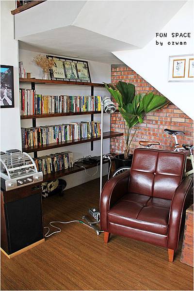 沙發區的另一側,樓梯下的角落,好多書,