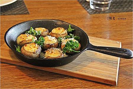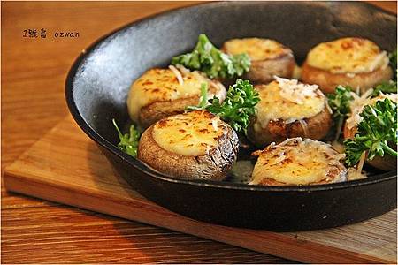 取大塊的蘑菇蓋,將鱈魚肝與鯷魚醬一同放進去,再舖上起司,做成焗烤,