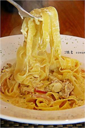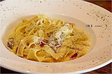 炒出鹹香味的自製培根,搭配帕馬森起司與奶油醬,十分濃郁,搭配我愛的寬麵,