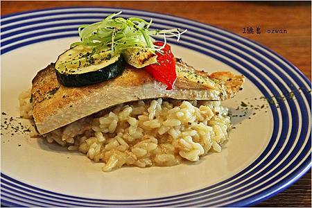 乾煎過的無刺虱目魚肚,整塊舖蓋在燉飯上,如果只有這樣好像太平凡了點,