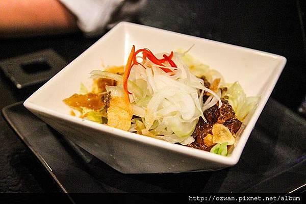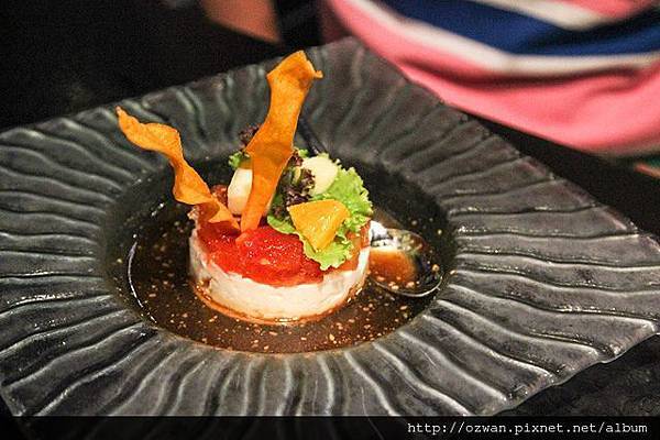底部是牛蕃茄、蒜味洋芋泥,頂層是蔬果,淋上和風醬汁,老郭吃得戰戰競競,
