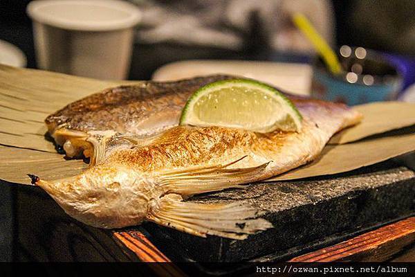 溫熱石板隔著竹葉,暖著細緻魚肉,外皮烤得酥脆,上桌就聞到淡淡的香味,