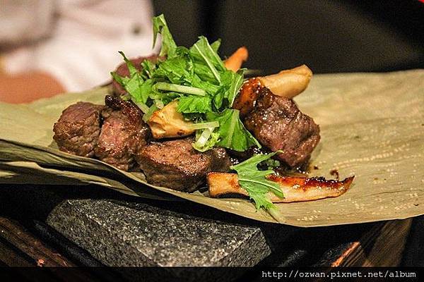 獨門醬汁醃製牛肉,先煎再烤,保留住牛肉的嫩度,跟一夜干相同,隔著竹葉溫熱,
