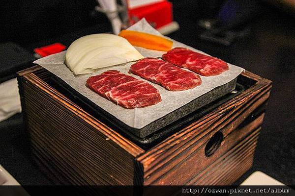 有著美麗油花紋路的牛肉盤,附加洋蔥、南瓜片,放在300°C的岩板瞬烤,讓血水封存,