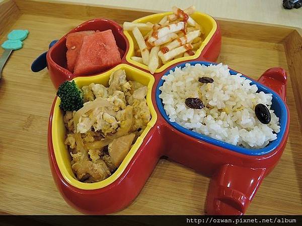 白飯的部分還用葡萄乾、黑豆擺成狗狗(有點像史奴比)的造型,蠻可愛,