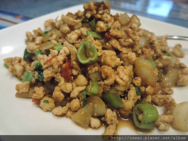 剁碎的雞肉,加入豆子、辣椒、九層塔、洋蔥拌炒,香氣都帶出來,